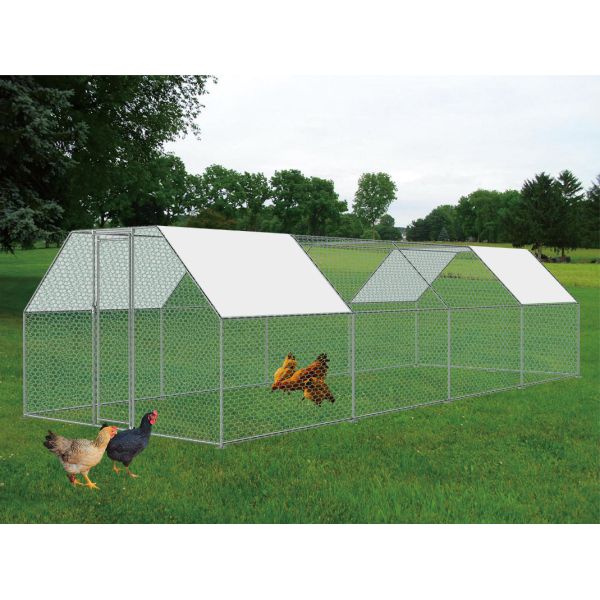 Your chickens will love the loose fresh air for exercise. DIY 10' W x 26.67' D x 6.67' H spacious chicken run. This shell is very suitable for small and large chickens in the backyard to prevent chickens from stray rain and sun protection to keep chickens safe. And the use of this shell especially fully considers chickens and other creatures such as rabbits, puppies, and guinea pigs that will thrive. This chicken uses galvanized pipes and a durable metal roof to ensure the stability of the box. What's even better is that your chicken will also stay cool, dry and happy. This Oxford cloth waterproof roof protector provides sun protection to block rain. The heavy chicken line completely surrounds both sides of the door and top to ensure that the chicken cannot escape and prevent uninvited guests from entering cm high. The galvanized swing door for easy entry and exit of the coop is locked to ensure maximum safety. This chicken coop set comes with all you need to build the shell, including assembly instructions to help you go through a simple process.